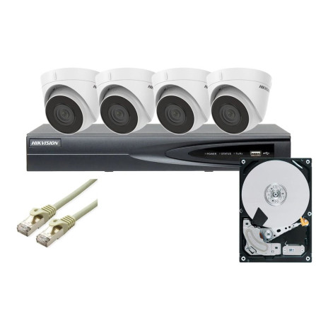 Kit sistem supraveghere IP Hikvision, NVR 4 canale, 4 camere dome 2MP, IR 30m, 4x patchcord, HDD, KITHIK4INT-4SFTP-1HDD